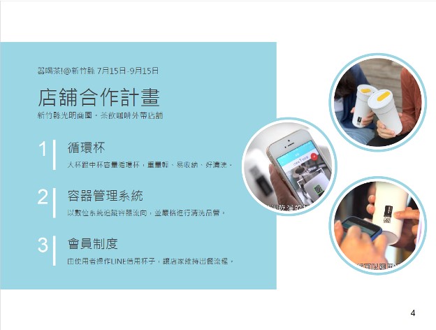 在店家部份,本局與本縣光明商圈內店(商)家共同合作,媒合店(商)家提供可重覆使用材質飲料杯、餐具服務,採用「你用我洗,這借那還」模式,達到垃圾減量目標,依統計結果指出實際減少約1,200個一次性容器使用(一次性杯子減量約963個、一次性餐具減量約243個)。