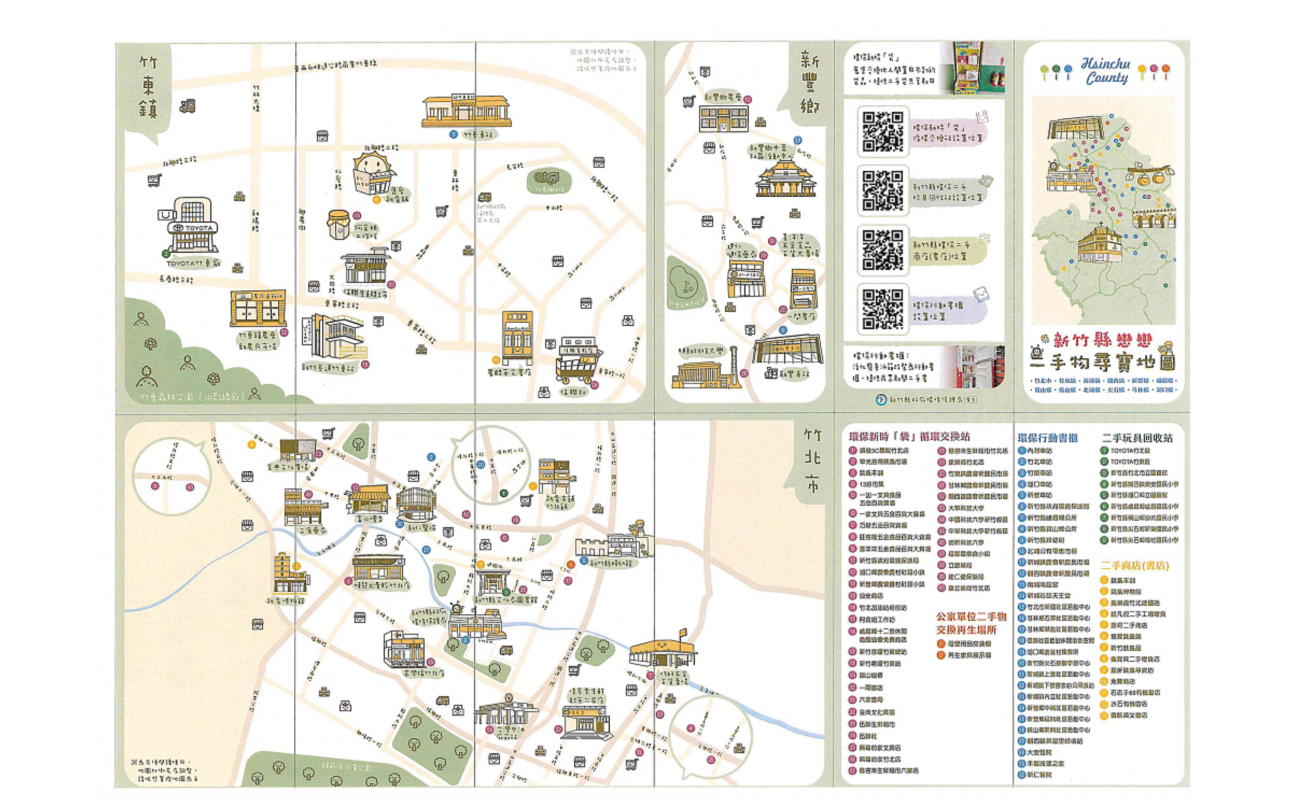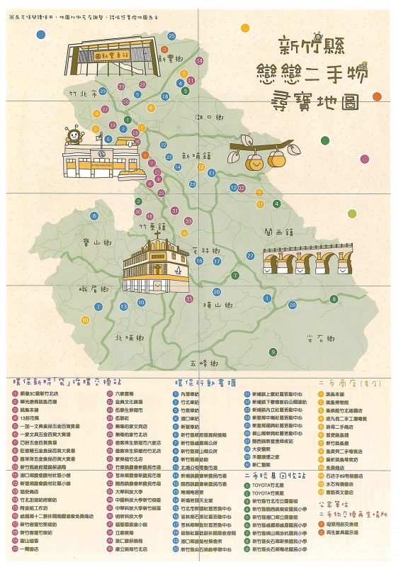 此外,尋寶地圖亦有標註40站環保新時袋循環交換站、30站環保行動書櫃、9站二手玩具回收站、13家二手商店(書店)及2處二手物交換再生場所,歡迎新竹縣市民朋友多多前往使用。