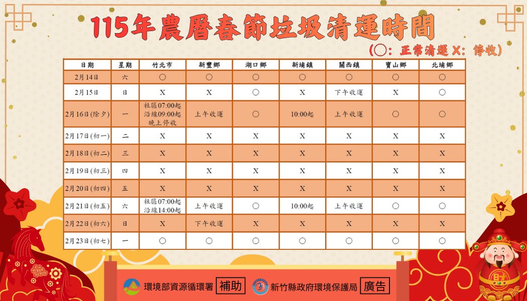 各鄉鎮(市)清潔隊春節期間垃圾清運時間已公告